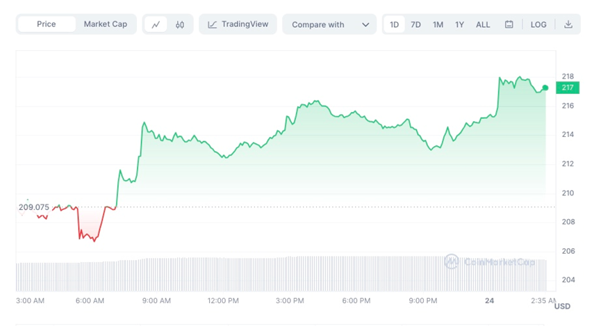 幣安幣Binance Coin (BNB)已回升至$215.5,24小時升幅達4.19%。Binance的首席執行官趙長鵬在8月23日向投資者傳達了好消息,宣佈其在美國的分支機搆幣安美國Binance.US已恢復了其充提款服務。