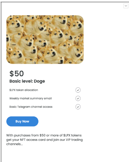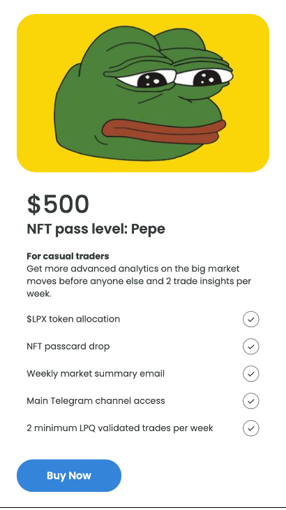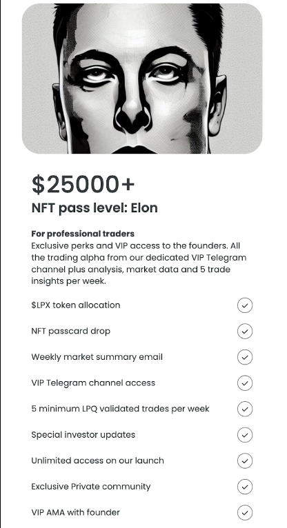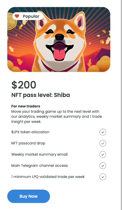 購買$LPX代幣達到$100或更多,即可獲得NFT通行證並加入我們的VIP交易頻道。