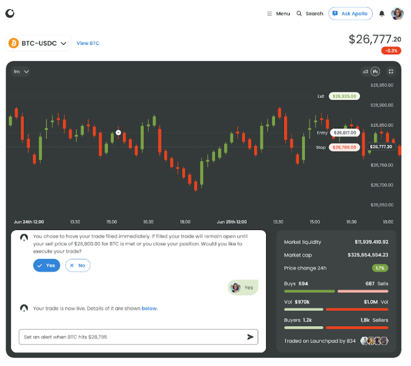 平臺入門始於Apollo,這是一個AI聊天機器人,將幫助您基於自己的風險設定檔、市場情緒分析、新聞和可行見解創建交易框架。還提供經驗交易員的個性化設置。所有這些都由Launchpad xyz專屬的大型語言模型AI提供。