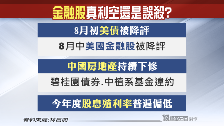 8月初惠譽在講評美國信用評等跟美國兩房債務評等。穆迪(Moody's)也下調10間中小型銀行評級,現在連標準普爾最後一家也跟進,等於三家國際信評都對美國銀行未來的風險打了大問號。美股8月以來已經從高點下跌:道瓊跌3.5%、那斯達克6%、費半8.6%。