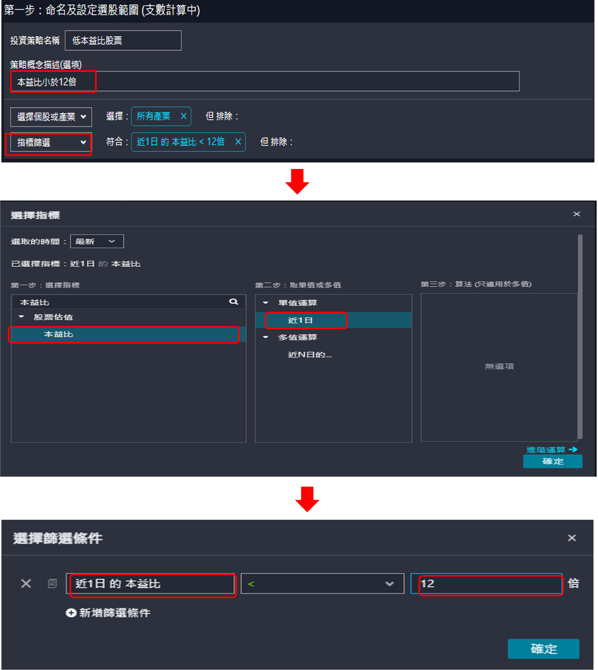 第二步輸入投資策略名稱,並選擇指標篩選,鉅亨易策略內建豐富的指標包含了基本面、技術面、籌碼面等指標,可以幫助投資人快速找出適合自己的選股條件,在範例中,我們選擇近1日本益比小於12倍的股票。