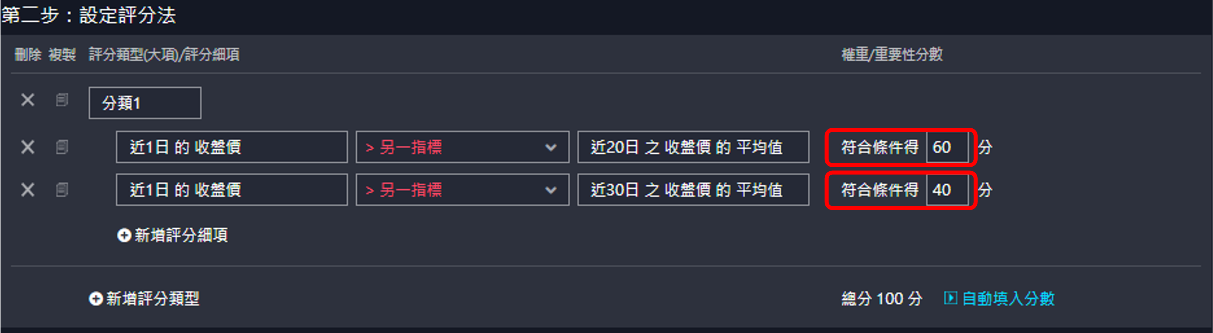 第三步設定評分法,設定評分的好處在於,你可以根據設定條件的重要性進行分級,在回測上可以根據評分做資金上的配置,在範例中我們將近1日的收盤價>近20日收盤價的平均值設定為60分,近1日收盤價>近30日收盤價的平均值設為40分。