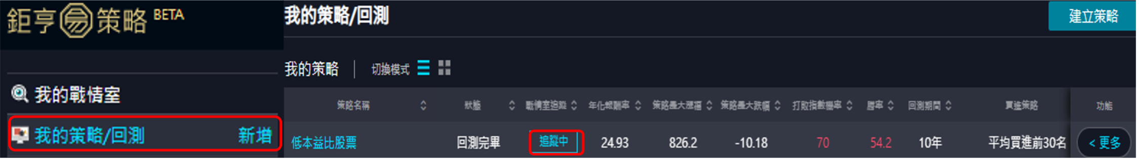 第六步返回並點擊左方選單中的我的策略/回測,我們將剛剛設定好的低本益比股票策略,點擊按下追蹤。