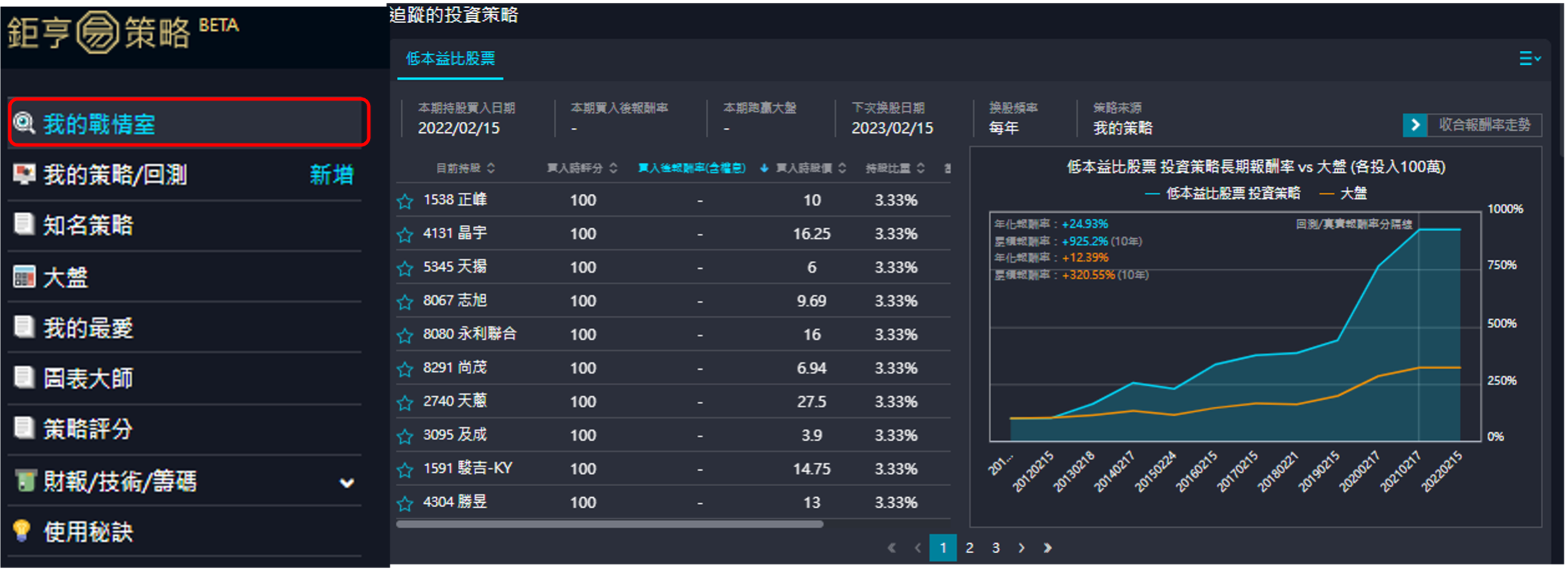 最後點擊左方選單中的我的戰情室,即能將剛設定好的選股策略做後續的追蹤。