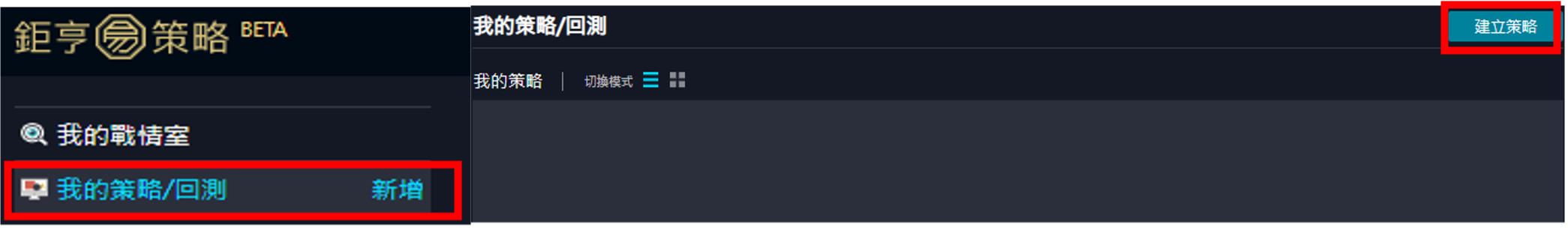 進入鉅亨易策略後,第一步點擊左方選單中的我的策略/回測,接者點擊右上角的建立策略。
