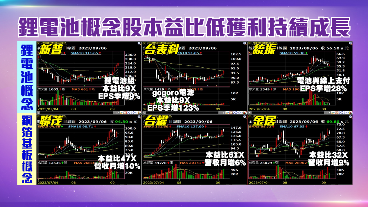 AI退燒之際,目前看到電動車有可能成為下一個市場的主流,而鋰電池的價格在這一年已經跌了六成之多。但我們看到從美國的雅寶到中國的寧德時代,中企贛鋒鋰業都在積極的爭奪鋰礦的版圖。所以現在重點在於當鋰價往下跌的時候,整個全球的市場去擴散鋰電池。比如說大家對未來2024-2030年鋰電的需求,可能以每年百分之二十的成長來做增加,因此這兩年下跌比較重的鋰電池就會是現在大家還未發現的寶石。我們可看新普這些做鋰電池概念模組,有台表科、統振等等,尤其是新普當作一個指標類股,投信已經持續加碼,而且目前看到本益比為9倍,比起現在比較熱門的銅箔基板概念,動則4’50倍,而且上半年沒有營收,我們認為這樣一個電池的概念,基本上基本面相對於會優於其他的概念股。接下來的重點是,當這類的鋰電池概念股拉回的時候,就可以進場的動作,值得留意來做觀察。興哥抖音