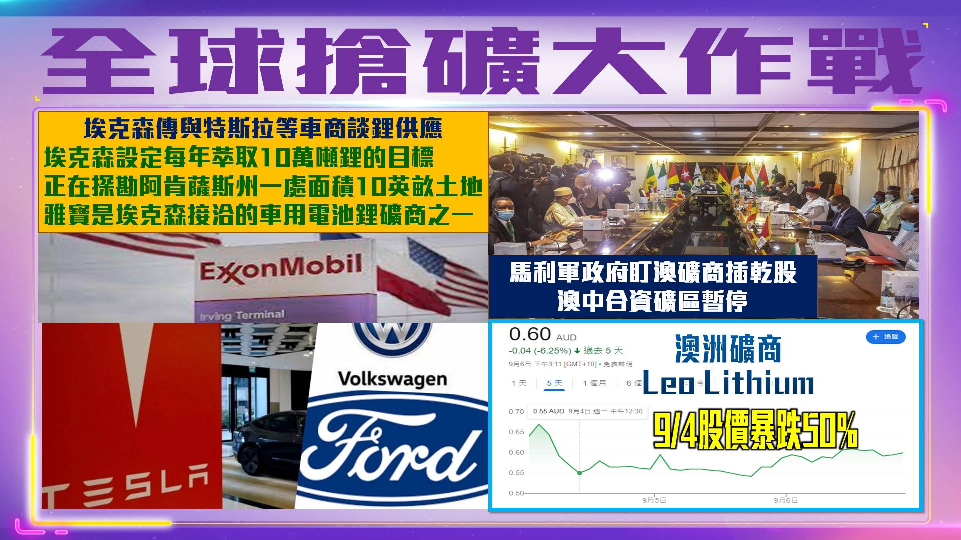 馬利軍政府盯澳礦商!股價暴跌50%!澳中合資礦區暫停! 一帶一路國家馬利(Mali)軍政府驅逐聯合國維和人員,求助於瓦格納集團,希望強化對領土的控制,更盯上澳洲礦商,要求澳洲礦商交出20%股權,喊停澳中合資礦區,導致澳洲礦商Leo Lithium 2023/9/4股價盤中一度下殺55%,收盤暴跌50.88%,吞噬了該公司的非洲鋰夢。 馬利暫停澳洲礦商Leo Lithium與贛鋒鋰業原礦石項目。根據澳洲證券交易所文件顯示,澳洲礦商Leo Lithium與贛鋒鋰業原礦石(direct shipping ore)項目營運遭馬里政府暫停。 Leo Lithium2023/9/4聲明,已於7/17收到馬利礦業部的信函,內容涉及直接運送原礦石、政府10%股權的情況以及項目進展的總體情況,馬利還成立一個委員會來審查這項投資案。馬利8月時祭出新的採礦法規,允許政府將其在開採項目中的股權增加到 20%。 Leo Lithium以 1.37 億美元的價格將其 Goulamina 鋰礦5% 的股份,出售給中企贛鋒鋰業,使這家中國鋰生產商擁有馬利合資企業 55% 的股權。