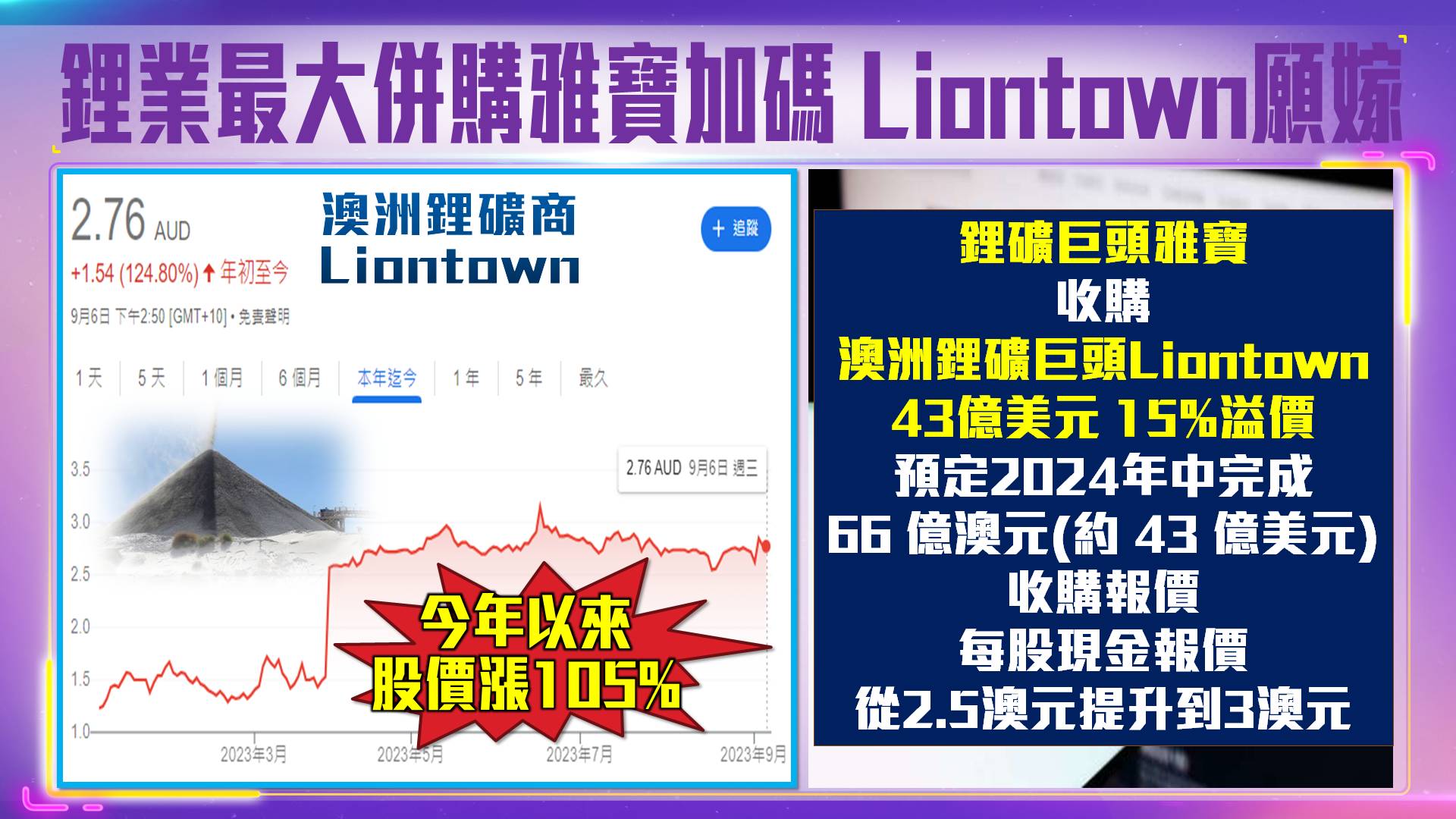 雅寶將每股現金報價從2.5澳元提升到3澳元。Liontown新的現金收購價為每股3澳元,較 9/2的最後收盤價2.62澳元溢價14.5%,比3月底雅寶提出的每股2.50澳元要約高出 20%。Liontown當天其股價上漲11%。