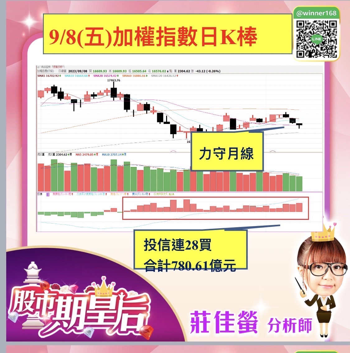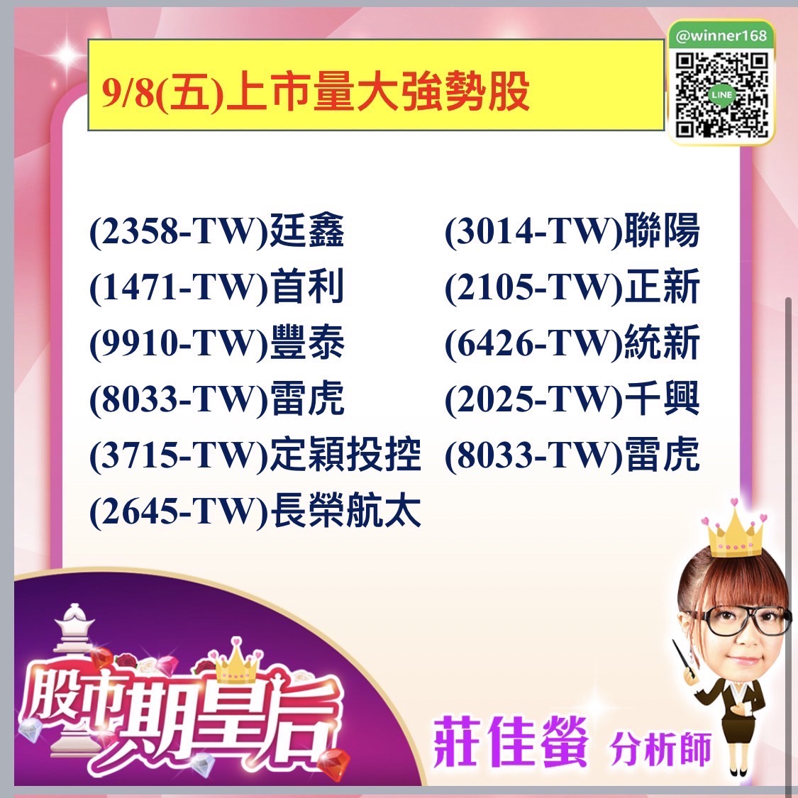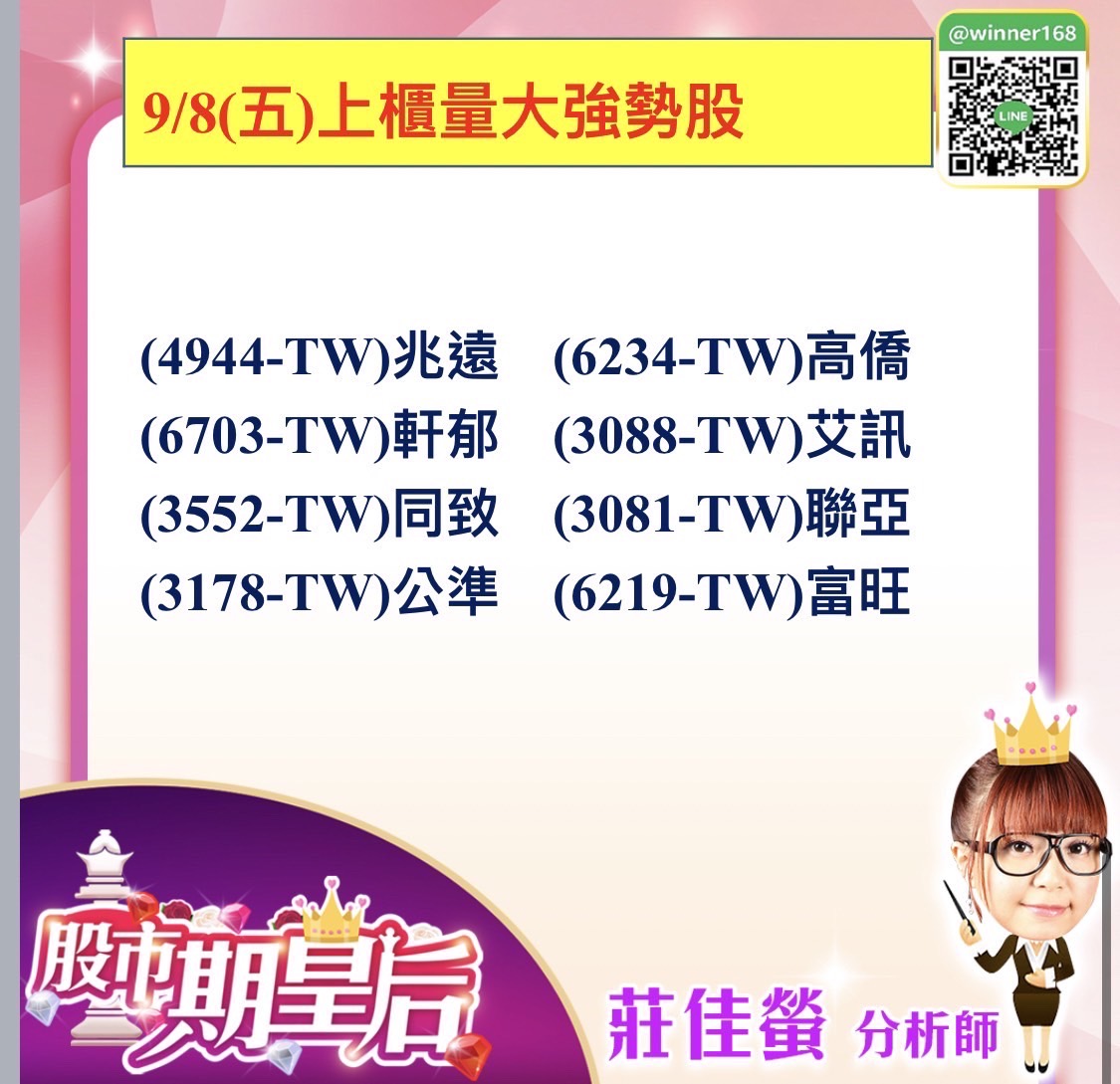 個股方面,權值股,(2330-TW)台積電,收紅K棒,公告8月營收1886億元月增6.2% 今年、歷年同期次高;IC設計族群,(2436-TW)偉詮電, 8月營收年增達50.96%,創近17個月新高,激勵股價走高,相對抗跌、(3014-TW)聯陽、(6451-TW)訊芯 - KY,股價走揚;軍工股相對穩盤,加上台北航太展下周登場,(2645-TW)長榮航太 、(8222-TW)寶一、(8033-TW)雷虎 、(5284-TW)JPP-KY,在買單敲進下都有不錯的表現;車用零組件(1319)東陽,有+5%漲幅,最新公布八月營收創下歷年同期最佳紀錄,激勵股價改寫新高,股價改寫七年以來新高點,成為投信鎖碼的飆股。我們更是早就預告在前面