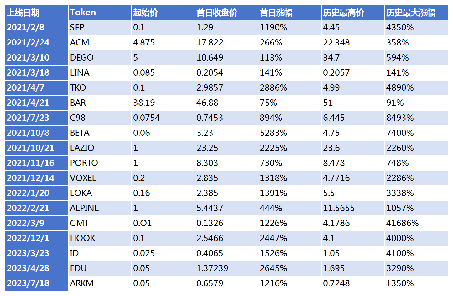 注:數據以 USDT 交易對爲準,首日漲幅以 UTC+0 收盤價進行計算,最大漲幅因不計算上線一小時内劇烈波動所産生的最高價格