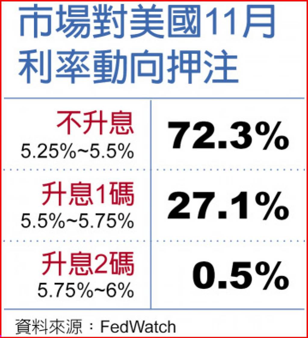 目前Fed的9月利率按兵不動幾乎已成定局,但分析師對於11月是否升息看法分歧。若就業市場與整體經濟降溫,帶動通膨持續回落,加上消費支出轉疲或銀行持續緊縮信貸等因素助攻,Fed今年便可能維持利率不變。要是通膨數據不降反升,Fed恐面臨更大升息壓力。