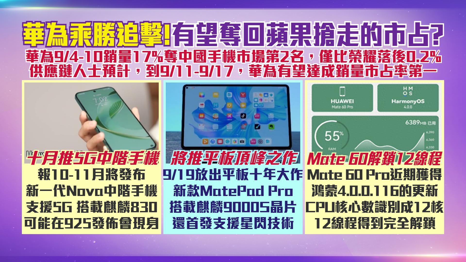 華為推出具備5G網速的新款手機,在中國熱賣斷貨。陸媒引述權威市調機構數據稱,華為已在第36週(9/4-9/10)以17%銷量奪得中國智慧手機市場第2名,僅比排名第一的榮耀落後0.2%。供應鏈人士預計,到第37週(9/11-9/17),華為有望達成銷量市占率第一