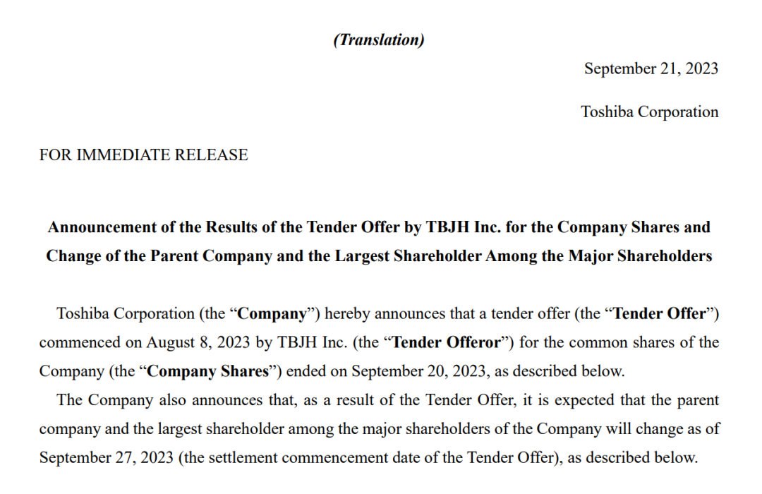 根據東芝先前公告,此次收購要約方TBJH株式會社(下稱TBJH)是一家成立於2022年11月的特殊目的公司,其主要目標是透過提供與業務重組和業務重組相關的風險資本,擴大東芝及其子公司和附屬公司的業務價值,促進業務成長並最大化東芝的投資價值,以支持日本的核心產業。上述財團由20多家日本公司組成,以每股4,620日圓(約227.6元人民幣)的價格收購東芝股份。