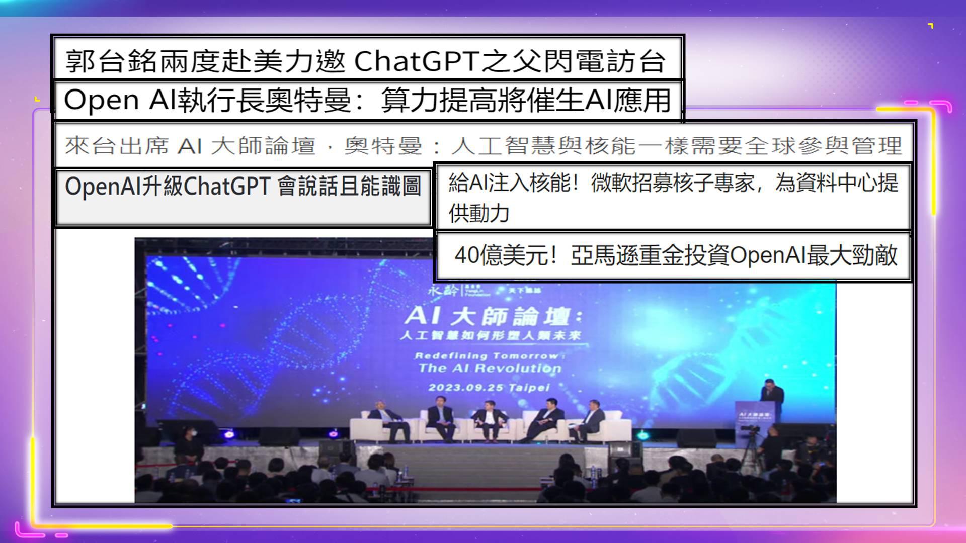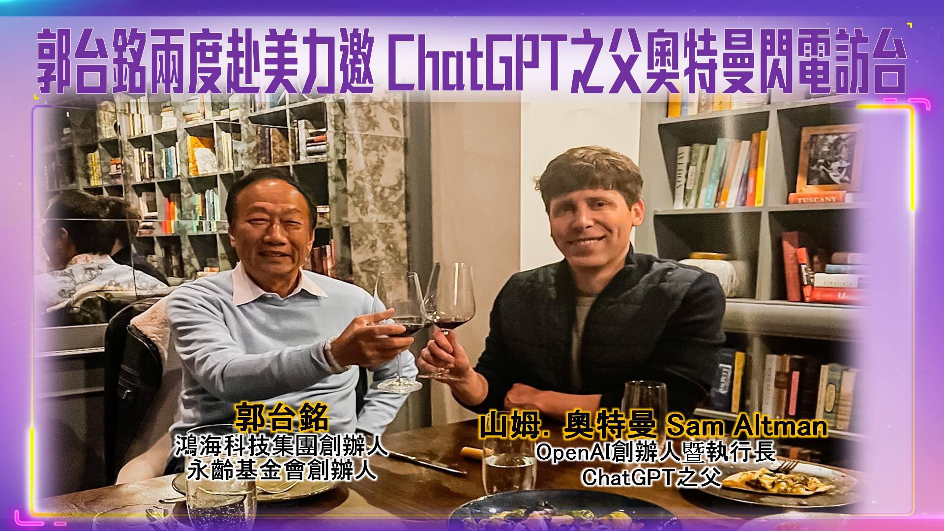 奧特曼透露這次來台灣停留不到24小時,鴻海創辦人郭台銘在論壇談話時表示,2023年郭董兩度飛往美國邀請奧特曼來台,終於促成此次專程來台進行兩小時演講,對於力邀世界頂尖的思想家與企業家共同聚集台灣,討論台灣如何在AI人工智慧領域走向最頂尖,「我對此感到無比的驕傲。」