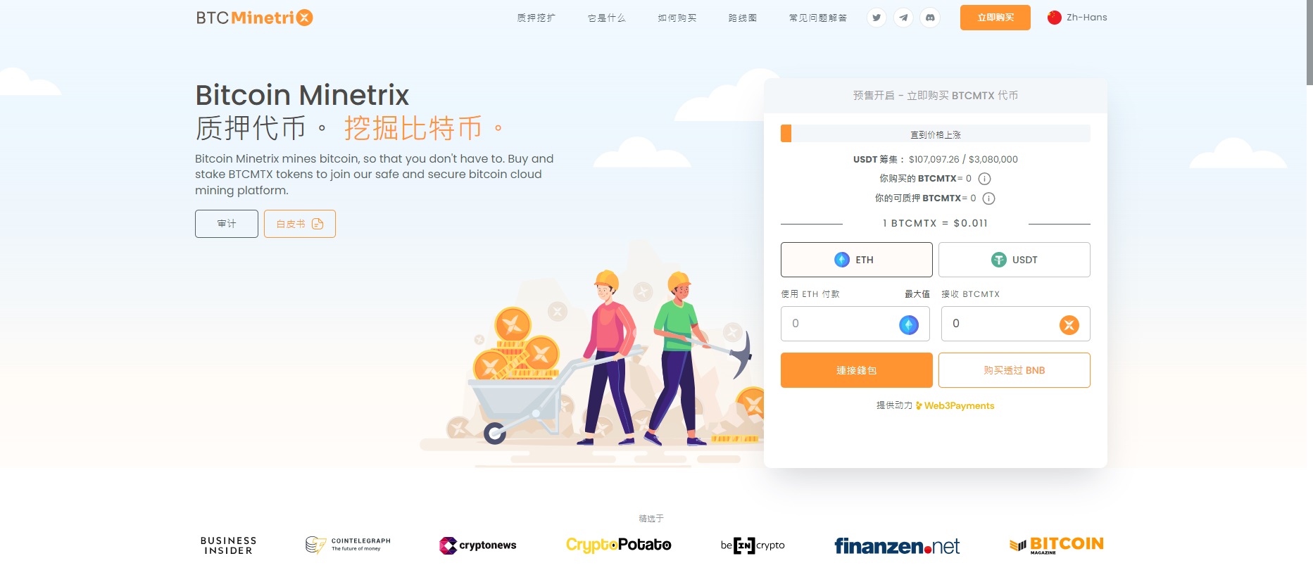 Bitcoin Minetrix是代幣化雲端挖礦,用戶可以在預售期間或者之後在去中心化交易所中央化交易所購買BTCBMT代幣,然後可以把代幣質押來挖礦比特幣。