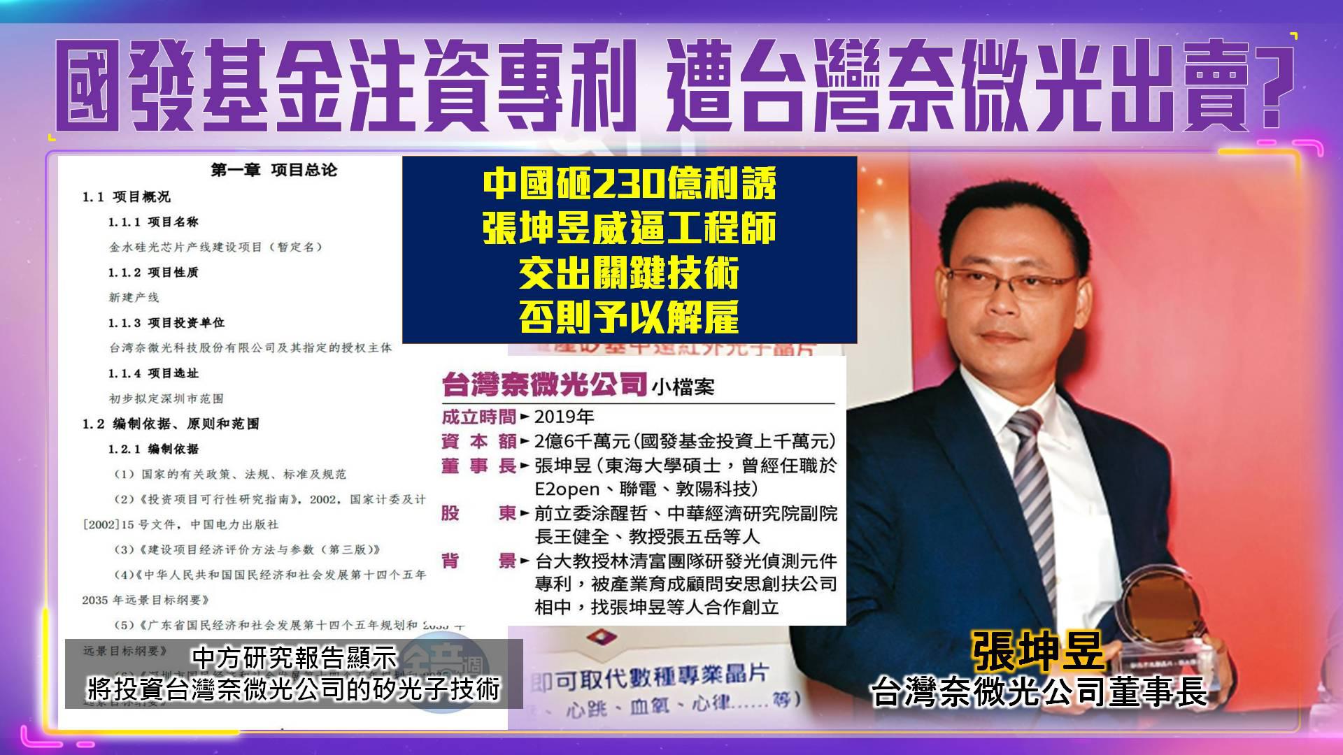 股東A先生爆料「董事長張坤昱透過對岸的人脈,與中國官員接觸,中方甚至已經提出可行性研究報告,計畫出資人民幣52億元(約新台幣230億元)在中國設廠利誘,張坤昱從2019年開始,說服資深技術人員,將相關專利、參數交給他,以獲取更大利益。只要遇到不聽話的,張的態度轉趨強硬,強行要求員工交出技術,否則予以解雇。