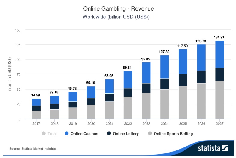 根據Statista編制的資料,預計2023年線上賭博行業的市場規模估計為950億美元。