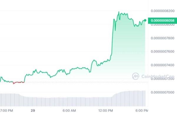 Pepe幣價格在過去 24 小時內飆升 10%,達到 0.0000008200 美元,而整個加密貨幣市場在同一時間段內上漲了 2%。