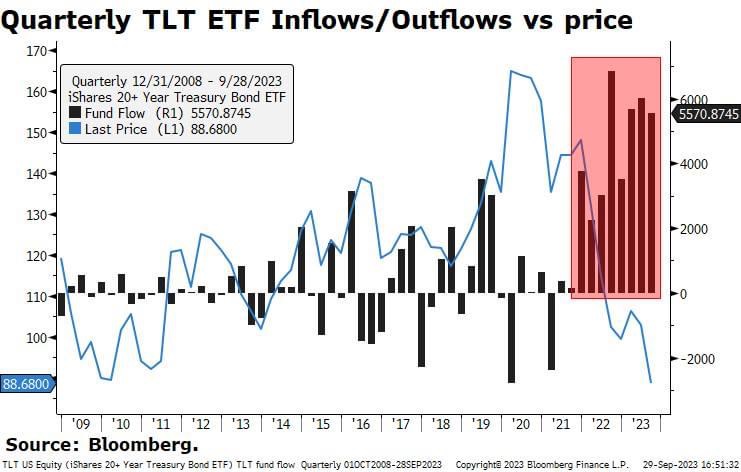 2021Q4 以來大量資金投入長天期國債 ETF TLT (圖 1-3),但其股價已經大跌 40%,9 月 FOMC 會議釋出利率點陣圖後,市場開始 priced in "higher for longer",S&P Global 分析可能繼續上升至...