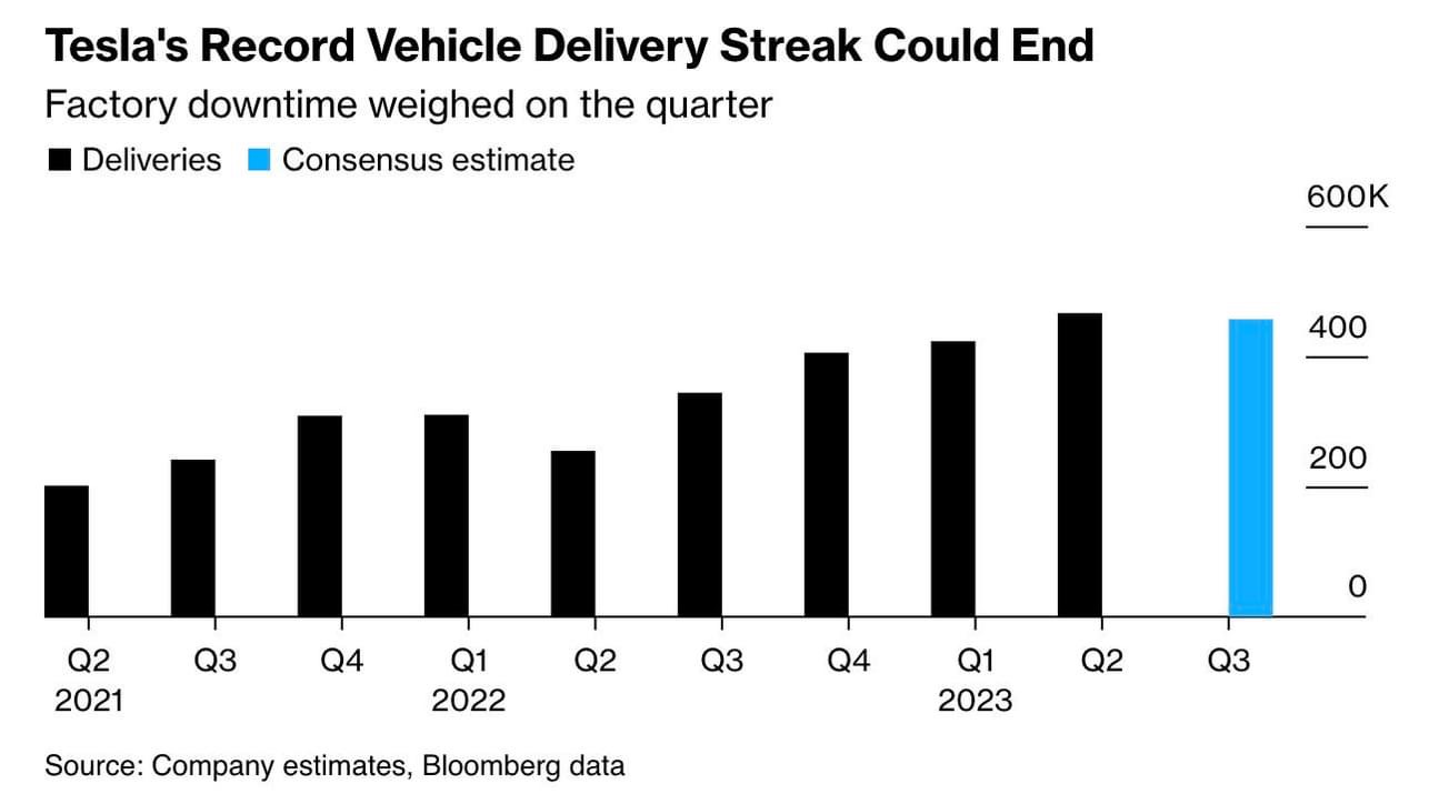 週一 Tesla 將發布 Q3 交付數據,由於部分工廠停工升級產線,華爾街分析師紛紛調降交付目標,目前均值為 456,722 輛,低於 Q2 的 466,140、打破連續四季成長趨勢 (圖 1-1),德銀分析師預估 Tesla 2024 ...