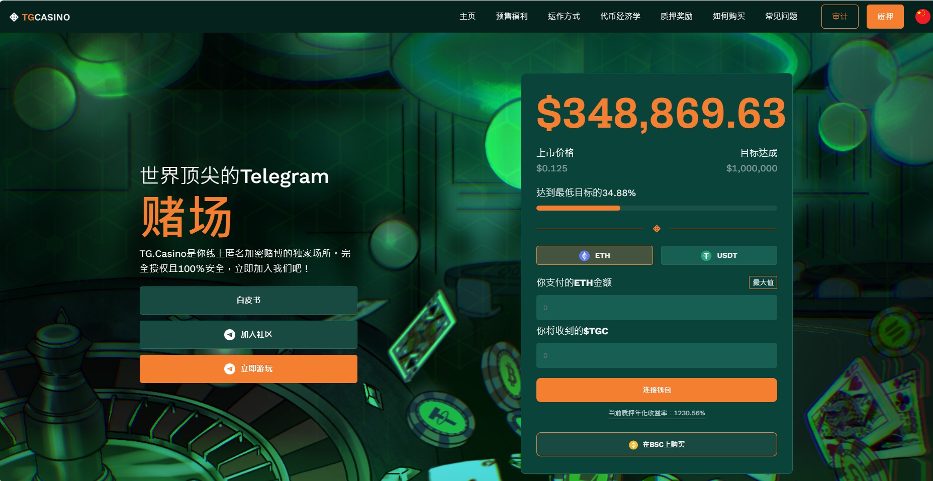 在預售期間大家可以用$0.125美元購買$TGC,是以此低價格獲得$TGC唯一機會,而預售時也是購買$TGC最佳時機。擁有後可立即開始質押以獲得4000%+ APY被動獎勵! 在$TGC預售中投資5千美元以上更可獲得獨家NFT,同時TG.Casino在Tg上市後,預售期之買家將獲得獨家獎勵。其中40%代幣被銷毀,60%代幣作為獎勵分發。