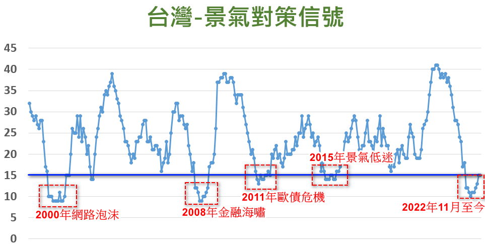 2000年12月-2002年02月歷經網路泡沫,連續15個月景氣藍燈。