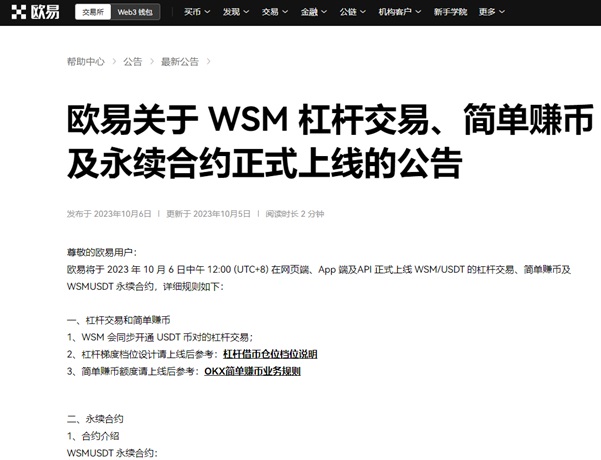筆者觀察到,近日華爾街迷因(Wall Street Meme)于歐易OKX上線杠杆交易、簡單賺幣與永續合約,此為數位貨幣交易平臺歐易OKX推出之創新交易產品,可以使使用者實現資產大增值。基於歐易OKX近日宣佈將推出WSM杠杆交易與WSM/USDT永續合約,市場皆在熱議,此決定能使用戶可以通過此等新產品實現WSM資產更多元化增值。