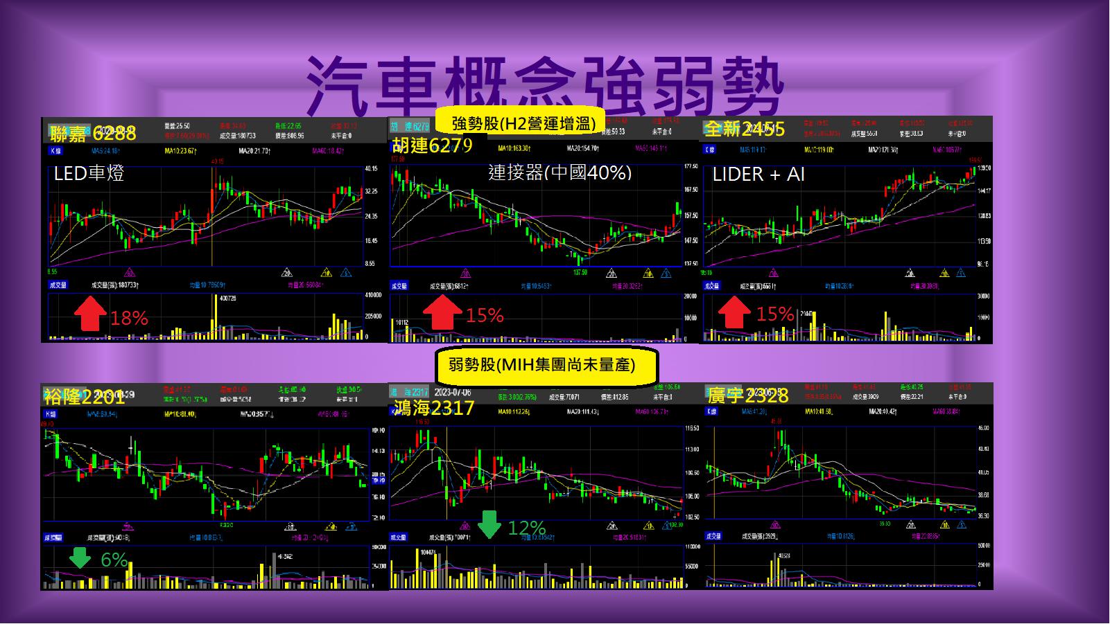 第四季的資金移轉應該會從AI轉到電動車,因為從中國的市佔看來比亞迪已經開始領先特斯拉,所以接下來的重點就是中國、歐洲都在大力發展新能車的同時。基本上它們是採取降價策略,日本根本學不上,因為他們成本過高。而急起直接的居然是印度,印度底特律是以低成本的電動車為主,發展的就是電動的摩托車,把Ola electric當作一個示範的中心。因此第四季我們選股的重點會往電動車走,強勢的族群是AM場包含6288車燈、6279連接器、還有2455全新月營收創新高;弱勢的標的以鴻家軍為主,逢回可以布局鴻海,其餘的部分我們認為以鴻家軍為首的MIH,就要等裕隆的新概念車推出的時候,正式量產,才會有一波的攻擊走勢。興哥抖音