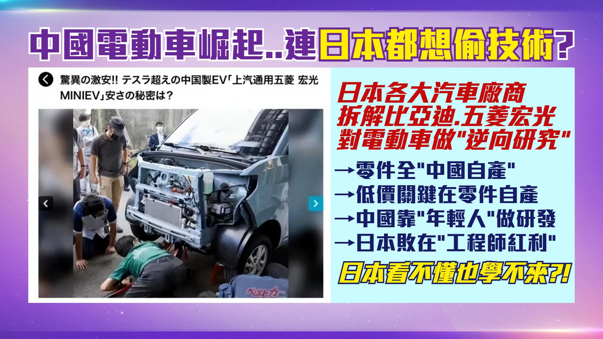 日本名古屋的停車場,停放了一大堆中國車,其中不少已經被拆解,連輪轂都是切開的。多數是日本各大汽車廠商買回來做「逆向研究」的車款。最多的當然是比亞迪,漢EV、海豚、元PLUS這些車隨處可見。同時也有極氪、蔚來的新車,甚至有不少宏光MINI EV。在日本汽車圈,掀起了一股中國熱。各大車企都在學習中國的新能源車,怕自己一不小心被對手甩開了。