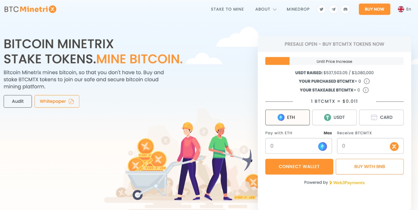 要購買$BTCMTX代幣,您需要ETH、USDT、BNB或銀行卡。如果您計畫使用ETH購買,您可以立即開始質押挖礦。