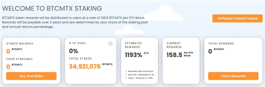 參與Bitcoin Minetrix,您可以獲得兩個 passiv 來源。首先,有$BTCMTX代幣,目前年化百分比收益率為1,193%。每產生一個乙太坊區塊,就會獎勵158.5個$BTCMTX。