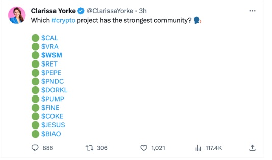 在X平臺上,擁有250萬粉絲的Clarissa Yorke正在詢問哪個加密項目擁有最強大的社區。對於該專案來說,$WSM排名第三是一次巨大的行銷勝利。