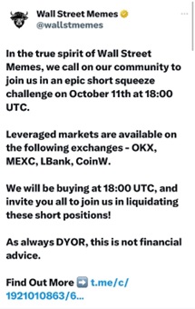 華爾街傳來消息,WSM 社區計畫在 10月11日 UTC 時間18點,集結投資者在OKX、MEXC等交易所,同步做多加密貨幣的杠杆合約。他們意圖故意結合眾人力量推高價格,強迫做空大戶止損平倉從中獲利。這種有組織的市場操作手法與正常投資行為不同,屬於人為操縱價格、策劃散戶人海戰術「聯合軋空」的另類投資舉動。