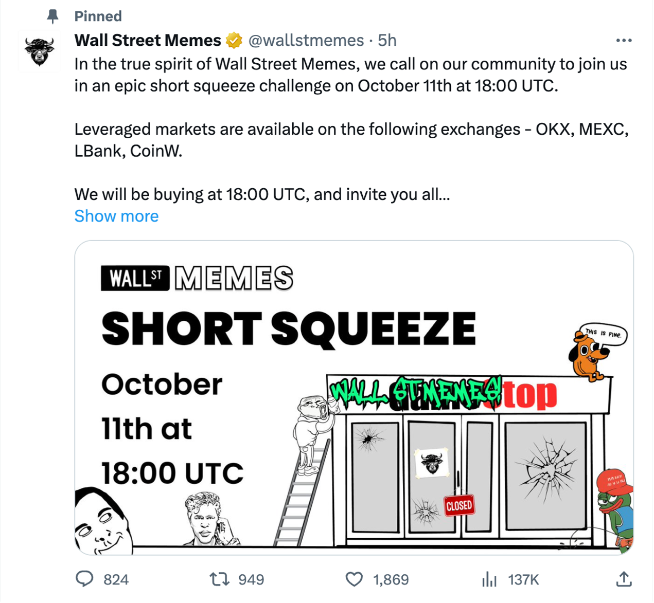 華爾街模因Wall Street Memes擁有超過110萬追隨者的高度互動社區,分佈在X、Instagram、Telegram和Discord等社交媒體平臺上,因此WSM的空頭擠壓活動有很大成功機會。