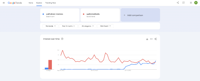 要評估空頭擠壓活動的潛力,可以考慮“華爾街模因”搜索詞隨時間的搜索興趣已超過“華爾街博弈”,如下面的Google趨勢圖所示: