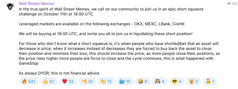 華爾街模因社區積極回應了空頭擠壓的呼叫。電報群中的一則消息獲得了541次點讚: