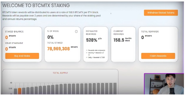 這創造了雙重收益功能,使持有者首先以驚人的733%年化收益率賺取$BTCMTX代幣 - 每產生一個ETH區塊獎勵158.5個$BTCMTX。