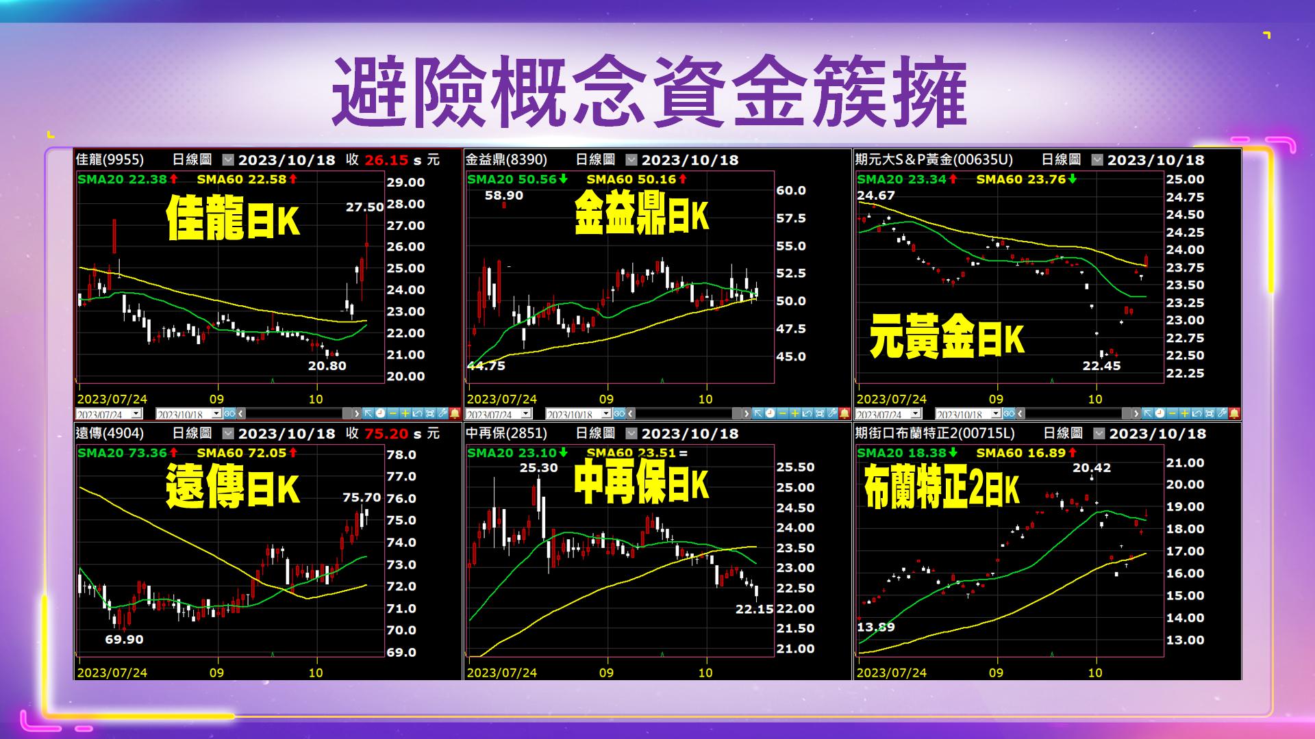 週二戰事越演越烈,暫時沒有看到轉圜的跡象。尤其是在巴勒斯坦的醫院被炸的同時,原本的中東四方峰會暫時被取消。那美國方面基本上受惠的就在於軍功國防概念股,所以以洛克希德馬丁為首的國防概念股,其波動為不少。但是對於台灣市場的這些軍工概念股,看來影響不大。那如果所謂的戰事持續的話,最怕就是接下來會遇到所謂的原油禁令,所以目前看來整體的中東市場仍然不穩定的狀況之下。避險的資金其實流入幾個方向:1.原油的避險市場,所以對所謂的原油正1、原油正2,都可以來做一個切入的重點。2.接下來就是炮聲響黃金萬兩的黃金,從7月、8月開始即期的,目前回檔之後,開始做一個創高,所以黃金概念股包含原黃金、金益鼎、佳龍等等,都可以關注,目前看到往上衝高避險的現象。興哥抖音