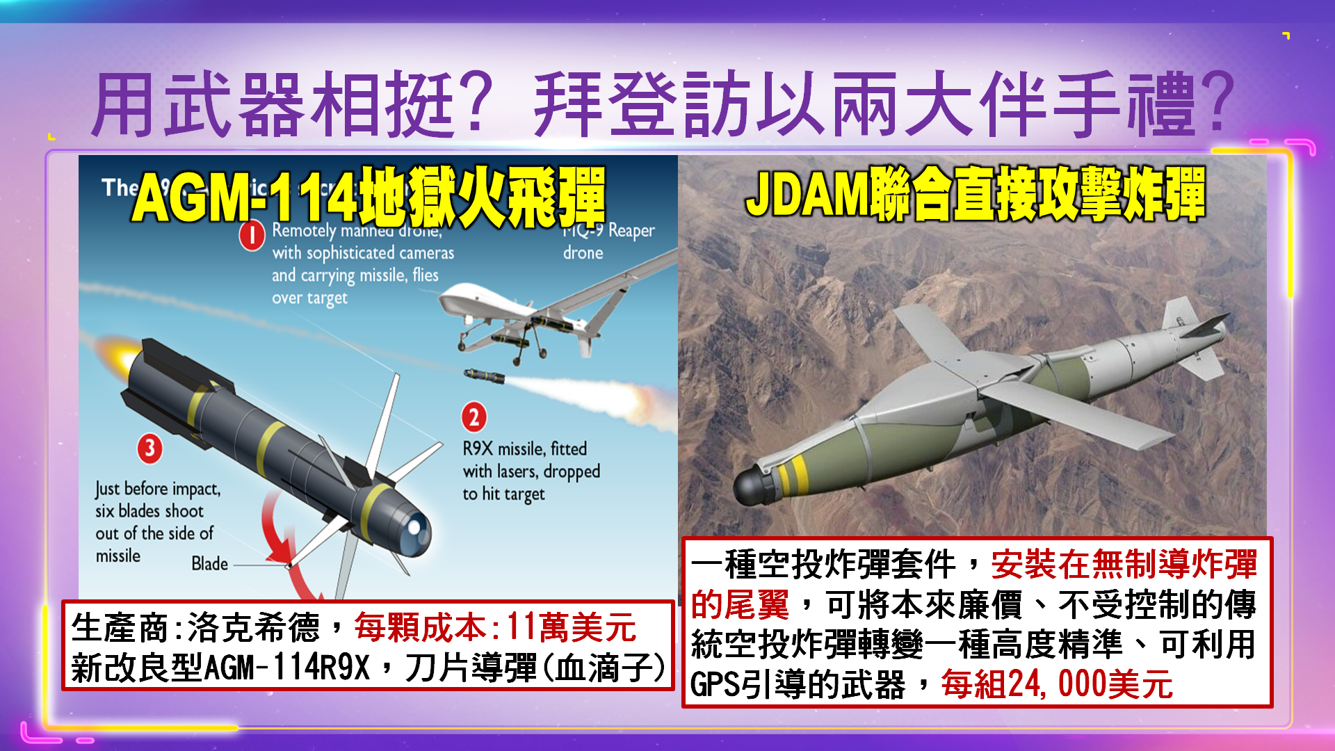 AGM-114「地獄火」飛彈是一種多平台、多目標的美國製飛彈,AGM意為「空對地」,主要用於反戰車,但後期型號也被用於無人機攻擊,精確打擊高價值目標等。最初飛彈名為「直升機雷射導引「射後不理」飛彈」(Heliborne laser, fire-and-forget missile),後以英文名稱的縮寫「地獄火」為其正式名稱而廣為人知。生產商正是洛克希德,每顆單位成本110,000美元。