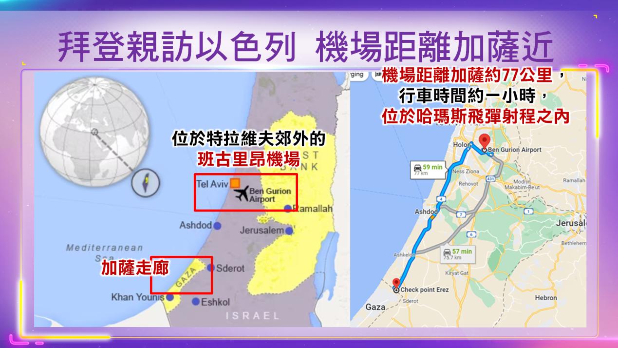 拜登此次出訪不僅是對美國重要盟友展現堅定支持,也向該區其他國家示警,避免戰事升級,但風險也甚高。紐約時報報導,首先,位於特拉維夫郊外的班古里昂機場(Ben Gurion Airport)距離加薩僅約40哩,位於哈瑪斯飛彈射程之內,實際風險顯而易見。布林肯16日和內唐亞胡在特拉維夫開會期間,飛彈空襲警報響起,兩人及以色列內閣官員被緊急送往一處掩體並避難5分鐘,才再前往軍事指揮中心繼續討論。