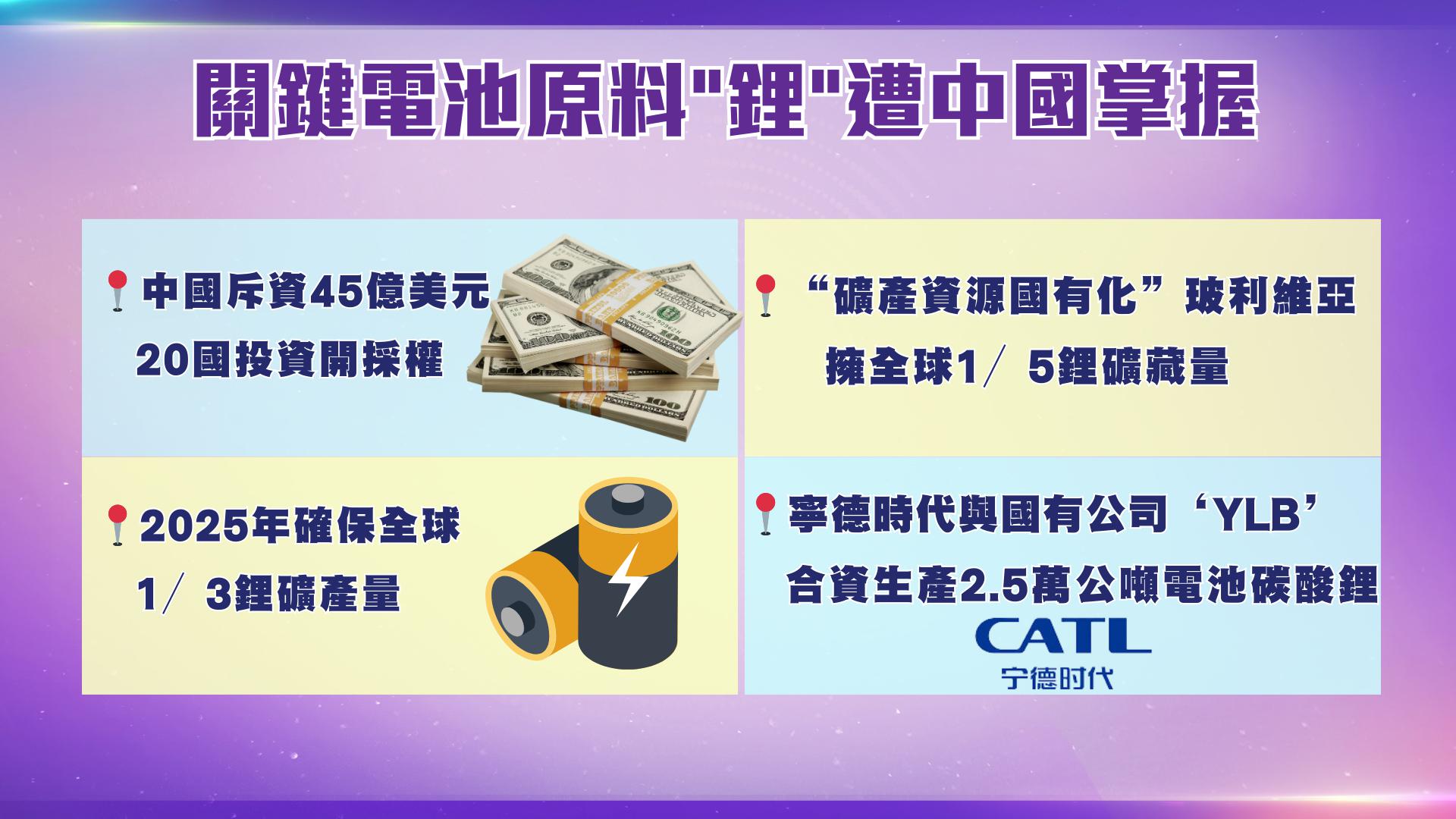 中國大陸近幾年花費鉅資在玻利維亞、辛巴威等國家投資合作鋰礦的開採權,粗估到2025年底,北京有望確保獲得全球1/3鋰礦的產量。