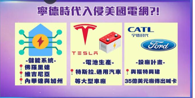 最令FDD不安的是,寧德時代為美國電力公司提供大量儲能發電廠。已裝置在佛羅里達、維吉尼亞、內華達與加州的發電廠。除此之外,電動汽車電池還供應給特斯拉、通用汽車等大型車廠,本來還計畫與美國汽車廠福特在密西根州興建35億美元的電池廠,但因抗議傳出福特暫時喊卡。