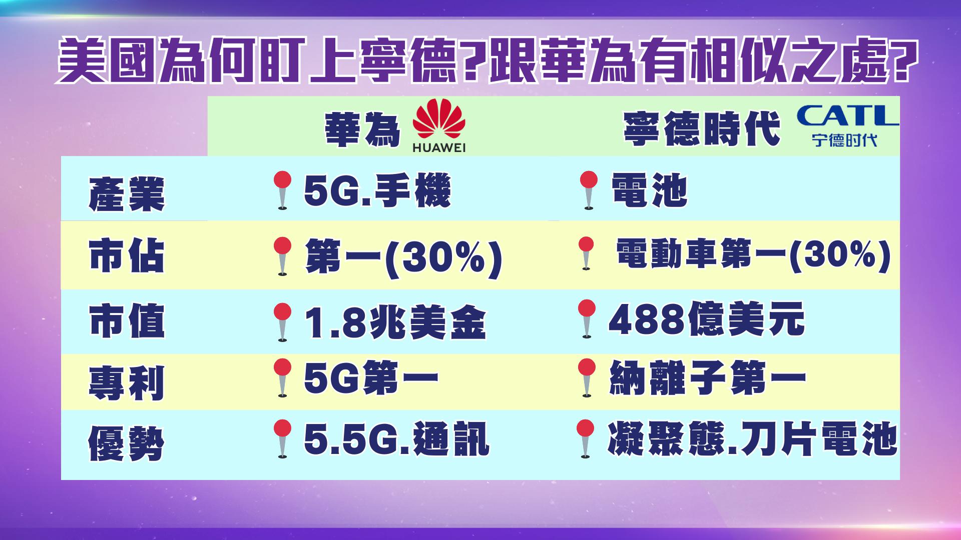 華為當初遭到封鎖跟現在的寧德時代,似乎很多優勢都有共同點。舉例來說:華為VS.寧德的比較。