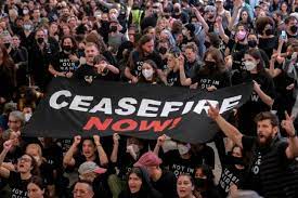 這次大規模靜坐是由「猶太和平之聲組織」紐約分會發起的。該組織表示,數千名成員參加了抗議活動,並堵住了紐約中央車站的主要通道。中央車站擠滿了抗議者,他們舉著寫有「巴勒斯坦人應該自由」和「哀悼死者,為生者拼命」的橫幅。