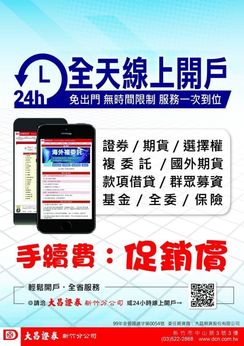大昌證券新竹黃靖貽24小時線上開戶證券、期貨選擇權、股票期貨、海外期貨、複委託手續費優惠價~
