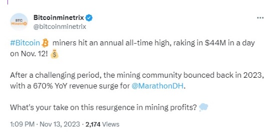 全球最大的比特幣礦工 - 馬拉松 - 報告稱,在2023年第三季度,其平均雜湊率達到了14.2艾雜湊每秒(年增長500%),約占整個網路雜湊的4%(每月挖掘大約1153 BTC,價值42.2百萬美元)。