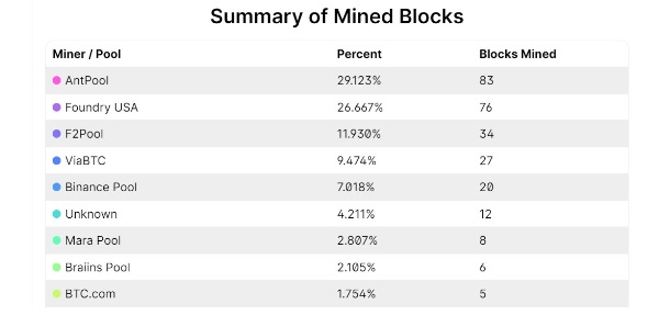 AntPool挖掘了最多的區塊,達到了83個(29.123%),而第二大挖礦池Foundry USA挖掘了76個區塊(26.667%)。