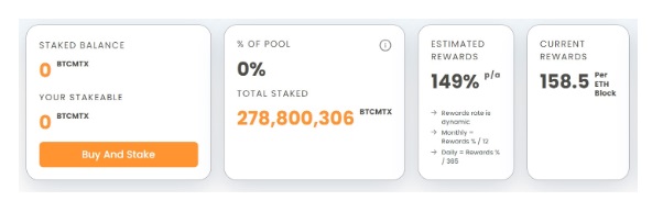 隨後,積極質押他們的$BTCMTX代幣的用戶將以目前的149%年化收益率獲得更多代幣,作為一種新穎的質押-挖礦機制的一部分。