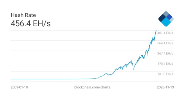 比特幣的雜湊率(衡量指向挖掘比特幣區塊的總計算能力的指標)飆升至令人難以置信的456.6艾雜湊每秒(EH/S)的歷史新高。