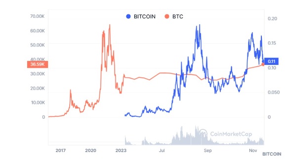 這種對比特幣衍生代幣的市場需求已經通過$BTC的表現得到證明,截至目前,其年初以來漲幅為120%,而與之相對的$BITCOIN則實現了+5,520%的年初以來漲幅。